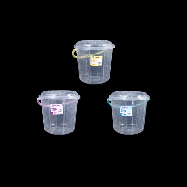 5 Litre capacity round transparent bucket with milky way etching design with cover and a plastic handle. Stay organized with this cute bucket at home, office, or in retail shops. Available transparent bucket in six beautiful colour handles per bag.