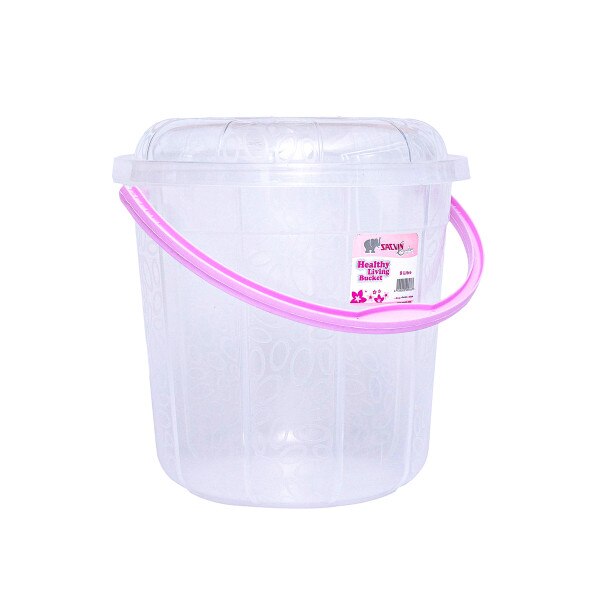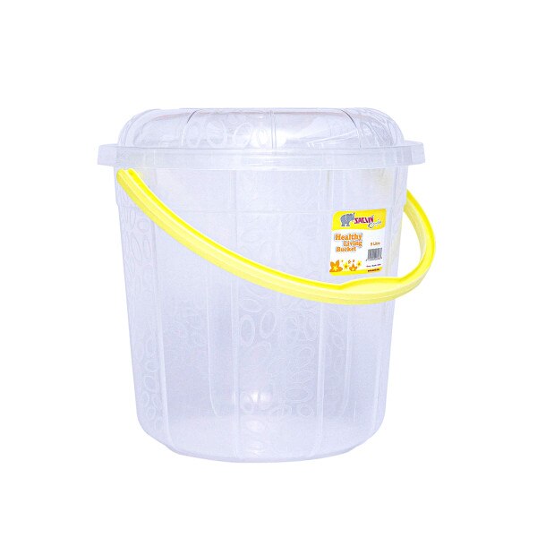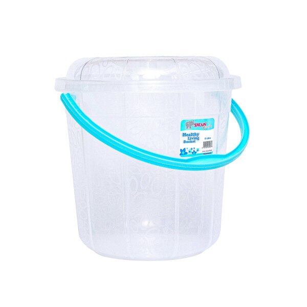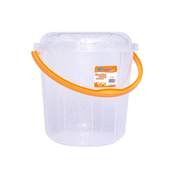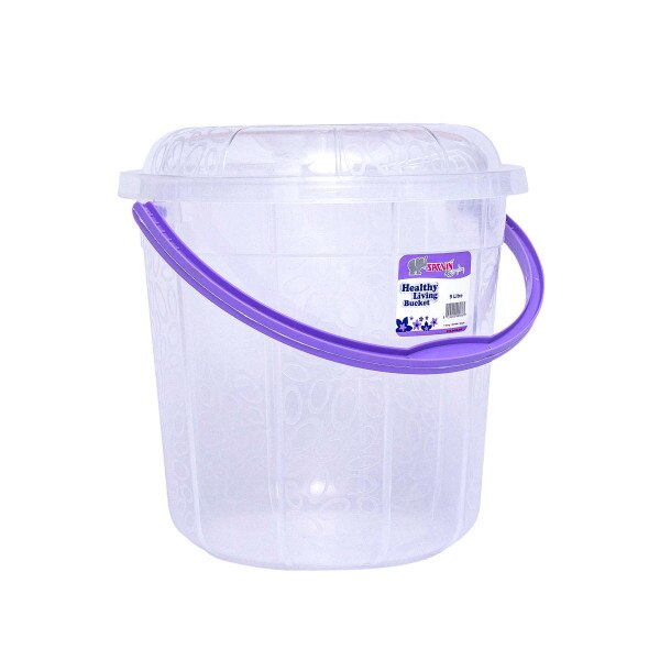 9 Litre capacity round transparent bucket with milky way etching design with cover and a plastic handle. Stay organized with this cute bucket at home, office, or in retail shops. Available in six beautiful colour handles per bag.